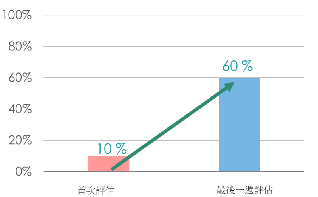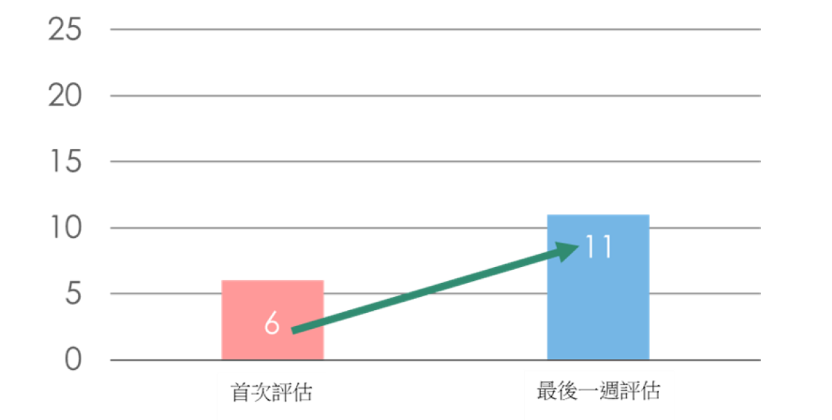 結果顯示,長輩的聽力閾值沒有明顯改變(圖4),且聽覺記憶在訓練後也沒有明顯提升。然而,長輩的聽辨正確率從10%顯著進步到60%(圖5)。另一方面,長輩在認知評估的分數也從6分進步至11分(圖6)。顯示即使長輩在未配戴助聽器的狀況下進行聽能復健,其認知及聽辨表現仍可進步。